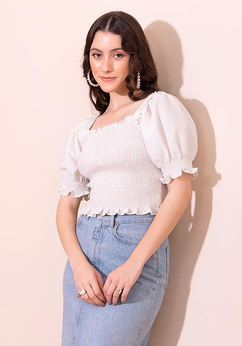 Description White crop top in crepe. Easy to slip on, it features short puff sleeves, a square neck and