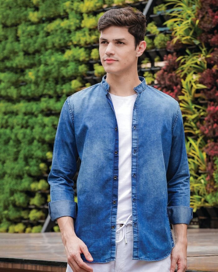 Wear the Chinese collar denim shirt as a light jacket over a plain white or graphic tee. Combine it with slim-fit jeans or chinos and ankle boots. Experiment with different textures and colors for the layers to add visual interest. Choose a pair of Bushirt Chinos for a laid-back and comfortable look. Keep the shirt untucked for a relaxed vibe.